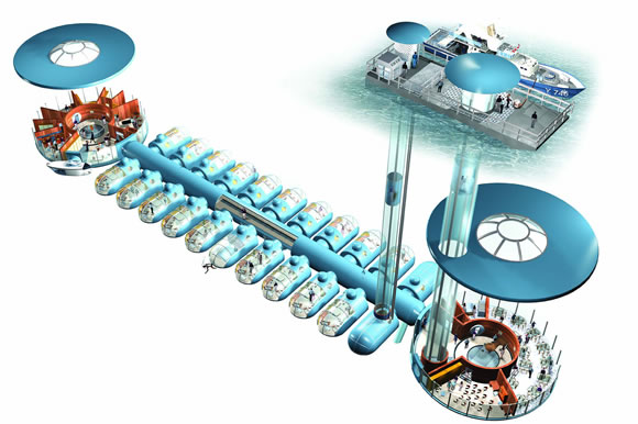 Today, however, more people live in space than submerged in H20. More research dollars are spent on establishing habitats on the moon and Mars than underwater. "Why does everyone live on land anyway?" asks Canadian astronaut Chris Hadfield. "Three-quarters of our planet is water and yet mankind is clustered haphazardly on the land. From space you can easily see where people are congregated. You just look for the 'Big Smear,' the bands of pollution that permanently surround our large cities." "It is said that if we could handle the density of Manhattan, the whole population of North America could be placed in a state the size of Connecticut," Hadfield tells visitors at the Ontario Science Centre. "On land we have randomly chosen where we live. But in the water, there would have to be more order. Living underwater, like living in space, has some challenges – breathable air, potable water, construction constraints and temperature – but there are advantages, too. "It would take housing pressures off agricultural land and allow (the city) to access underwater resources for cooling, insulation, electricity and, of course, water."