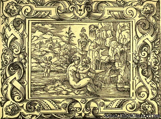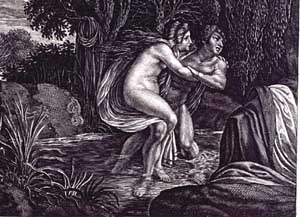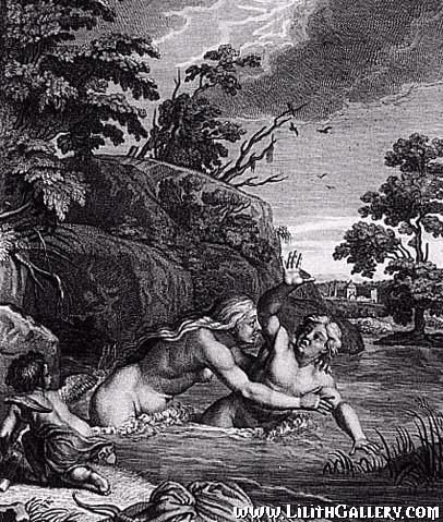 The Story of Salmacis and Hermaphroditus How Salmacis, with weak enfeebling streams Softens the body, and unnerves the limbs, And what the secret cause, shall here be shown; The cause is secret, but th' effect is known. The Naids nurst an infant heretofore, That Cytherea once to Hermes bore: From both th' illustrious authors of his race The child was nam'd, nor was it hard to trace Both the bright parents thro' the infant's face. When fifteen years in Ida's cool retreat The boy had told, he left his native seat, And sought fresh fountains in a foreign soil: The pleasure lessen'd the attending toil, With eager steps the Lycian fields he crost, A river here he view'd so lovely bright, It shew'd the bottom in a fairer light, Nor kept a sand conceal'd from human sight. The stream produc'd nor slimy ooze, nor weeds, Nor miry rushes, nor the spiky reeds; But dealt enriching moisture all around, The fruitful banks with chearful verdure crown'd, And kept the spring eternal on the ground. A nymph presides, not practis'd in the chace, Nor skilful at the bow, nor at the race; Of all the blue-ey'd daughters of the main, The only stranger to Diana's train: Her sisters often, as 'tis said, wou'd cry, "Fie Salmacis: what, always idle! fie. Or take thy quiver, or thy arrows seize, And mix the toils of hunting with thy ease." Nor quiver she nor arrows e'er wou'd seize, Nor mix the toils of hunting with her ease. But oft would bathe her in the chrystal tide, Oft with a comb her dewy locks divide; Now in the limpid streams she views her face, And drest her image in the floating glass: On beds of leaves she now repos'd her limbs, Now gather'd flow'rs that grew about her streams, And then by chance was gathering, as he stood To view the boy, and long'd for what she view'd. Fain wou'd she meet the youth with hasty feet, She fain wou'd meet him, but refus'd to meet Before her looks were set with nicest care, And well deserv'd to be reputed fair. "Bright youth," she cries, "whom all thy features prove A God, and, if a God, the God of love; But if a mortal, blest thy nurse's breast, Blest are thy parents, and thy sisters blest: But oh how blest! how more than blest thy bride, Ally'd in bliss, if any yet ally'd. If so, let mine the stoln enjoyments be; If not, behold a willing bride in me." The boy knew nought of love, and toucht with shame, He strove, and blusht, but still the blush became: In rising blushes still fresh beauties rose; The sunny side of fruit such blushes shows, And such the moon, when all her silver white Turns in eclipses to a ruddy light. The nymph still begs, if not a nobler bliss, A cold salute at least, a sister's kiss: And now prepares to take the lovely boy Between her arms. He, innocently coy, Replies, "Or leave me to my self alone, You rude uncivil nymph, or I'll be gone." "Fair stranger then," says she, "it shall be so"; And, for she fear'd his threats, she feign'd to go: But hid within a covert's neighbouring green, She kept him still in sight, herself unseen. The boy now fancies all the danger o'er, And innocently sports about the shore, Playful and wanton to the stream he trips, And dips his foot, and shivers as he dips. The coolness pleas'd him, and with eager haste His airy garments on the banks he cast; His godlike features, and his heav'nly hue, And all his beauties were expos'd to view. His naked limbs the nymph with rapture spies, While hotter passions in her bosom rise, Flush in her cheeks, and sparkle in her eyes. She longs, she burns to clasp him in her arms, And looks, and sighs, and kindles at his charms. Now all undrest upon the banks he stood, And clapt his sides, and leapt into the flood: His lovely limbs the silver waves divide, His limbs appear more lovely through the tide; As lillies shut within a chrystal case, Receive a glossy lustre from the glass. He's mine, he's all my own, the Naid cries, And flings off all, and after him she flies. And now she fastens on him as he swims, And holds him close, and wraps about his limbs. The more the boy resisted, and was coy, The more she clipt, and kist the strugling boy. So when the wrigling snake is snatcht on high In Eagle's claws, and hisses in the sky, Around the foe his twirling tail he flings, And twists her legs, and wriths about her wings. The restless boy still obstinately strove To free himself, and still refus'd her love. Amidst his limbs she kept her limbs intwin'd, "And why, coy youth," she cries, "why thus unkind! Oh may the Gods thus keep us ever join'd! Oh may we never, never part again!" So pray'd the nymph, nor did she pray in vain: For now she finds him, as his limbs she prest, Grow nearer still, and nearer to her breast; 'Till, piercing each the other's flesh, they run Together, and incorporate in one: Last in one face are both their faces join'd, As when the stock and grafted twig combin'd Shoot up the same, and wear a common rind: Both bodies in a single body mix, A single body with a double sex. The boy, thus lost in woman, now survey'd The river's guilty stream, and thus he pray'd. (He pray'd, but wonder'd at his softer tone, Surpriz'd to hear a voice but half his own.) You parent-Gods, whose heav'nly names I bear, Hear your Hermaphrodite, and grant my pray'r; Oh grant, that whomsoe'er these streams contain, If man he enter'd, he may rise again Supple, unsinew'd, and but half a man! The heav'nly parents answer'd from on high, Their two-shap'd son, the double votary Then gave a secret virtue to the flood, And ting'd its source to make his wishes good.