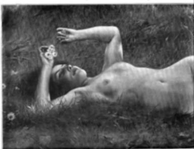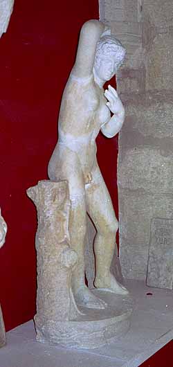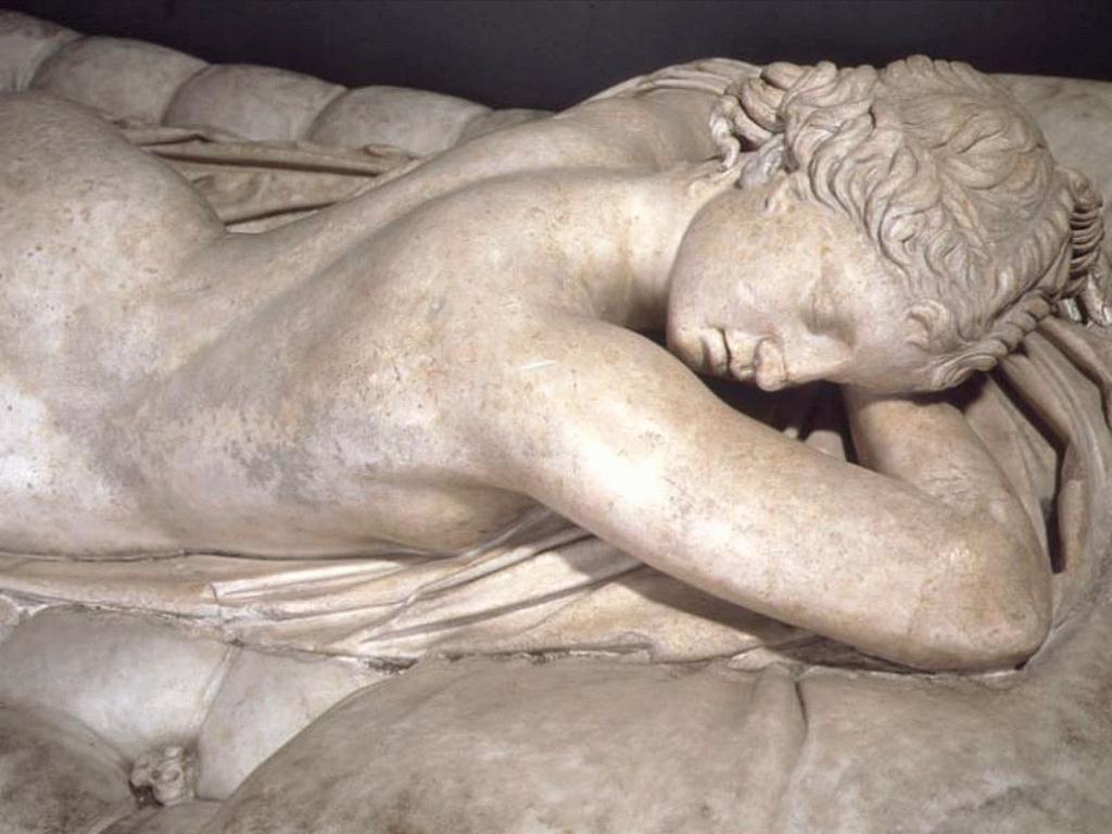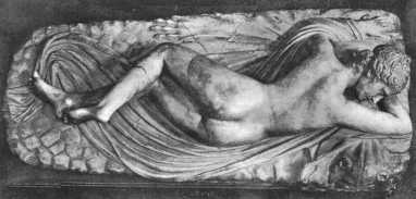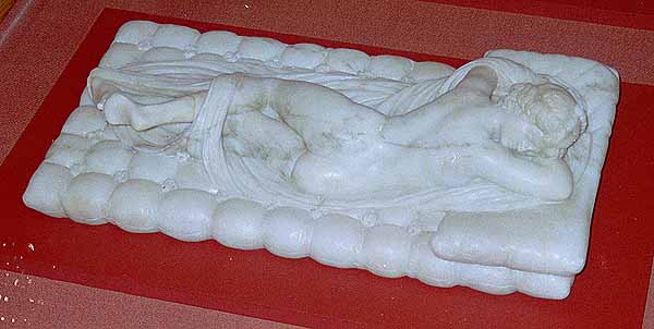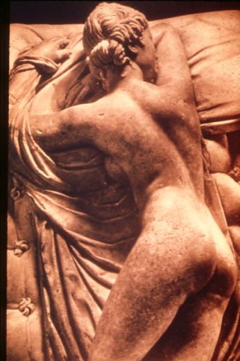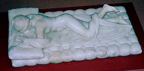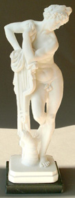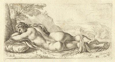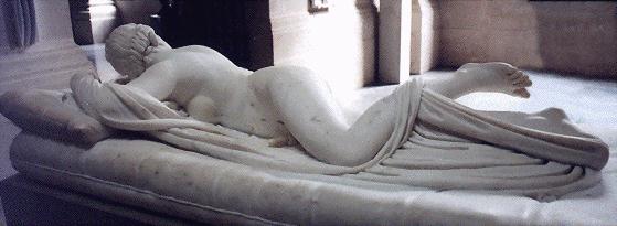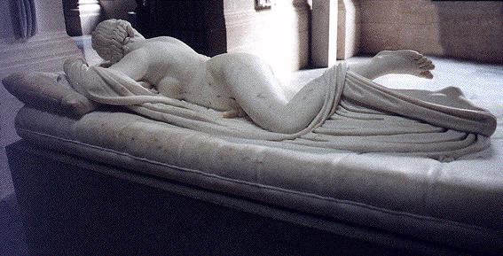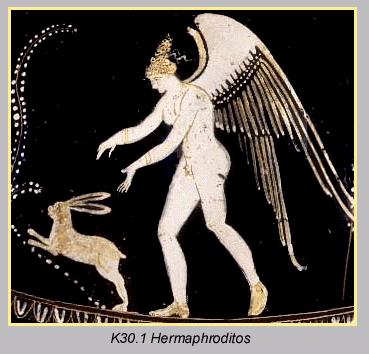 Synopsis of the Hermaphroditus Legend:Aphrodite and Hermes had a son together. He grew up to become an incredibly beautiful and masculine man. One day while he was in the woods, a nymph named Salmacis saw him and became so infatuated with him that she grabbed hold of him and refused to let go. She made a prayer to the gods to make them never part, and POOF! VOILA! A hermaphrodite! A man with breasts, or alternative a woman with a penis. Either way it was the Greek way of explaining why one out of every fifty people was a hermaphrodite. Hermaphroditus later became friends with Dionysius and the two gods are considered to be the patron gods of all hermaphrodites. Many artists like to portray Hermaphroditus as a woman raising up her skirts/robes to reveil a penis. Others like to portray the actual scene in which Salmacis sees and tackles Hermaphroditus, in a narrative format. The most famous however is a sleeping Hermaphroditus.